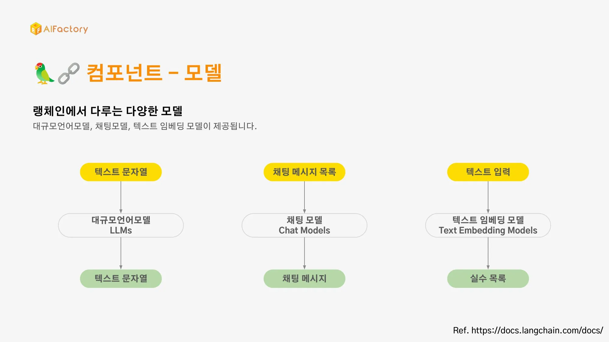 모델은 LLM, 채팅 모델, 텍스트 임베딩 모델 3가지 지원