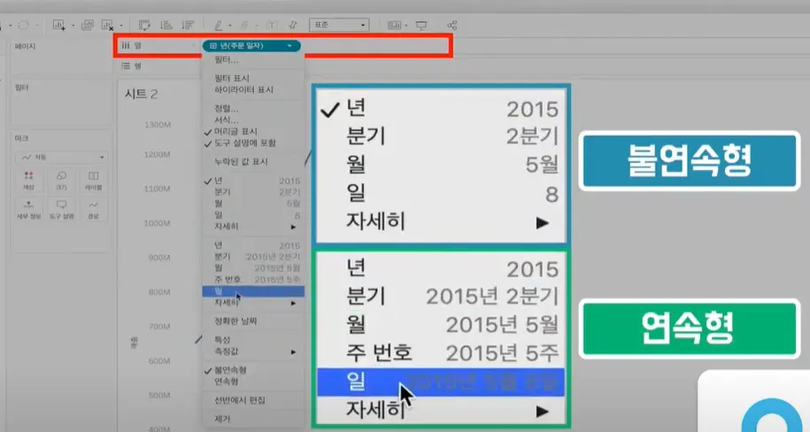불연속형 날짜 부분과 연속형 날짜 값 차이 설명하기