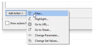 Add dashboard actions (e.g. filter action, highlight action, parameter control, URL action) 대시보드 동작 추가 (예를 들어 필터 동작, 하이라이트 동작, 매개 변수 컨트롤, URL로 이동)