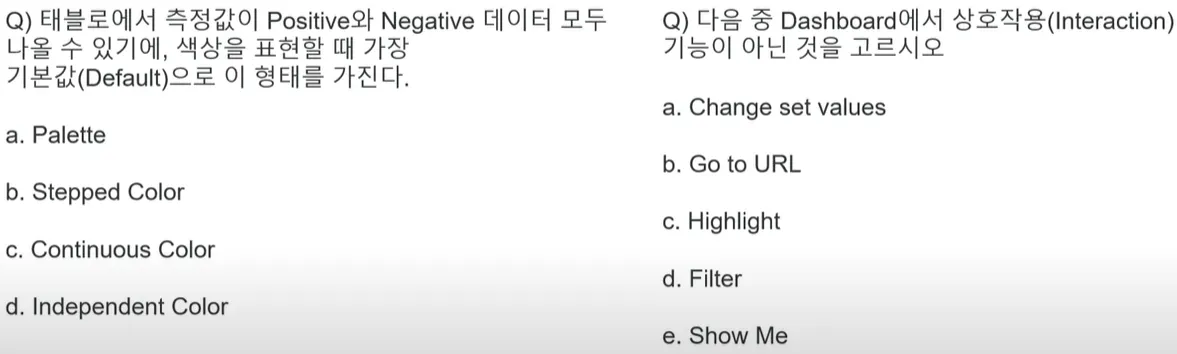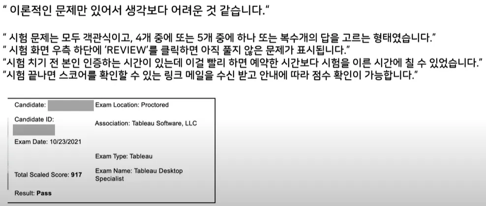 시험 항목들은 연상 또는 이해/지원 수준으로 치러야 함. 시험 도중 태블로 플랫폼이나 인터넷 또는 다른 외부 애플리케이션에 접근할 수 없음.