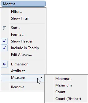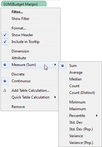 (In Tableau, to change the aggregation of a measure we need to visualization right click on the measure and then go to Measure. Select any of the desired aggregate for that measure.)