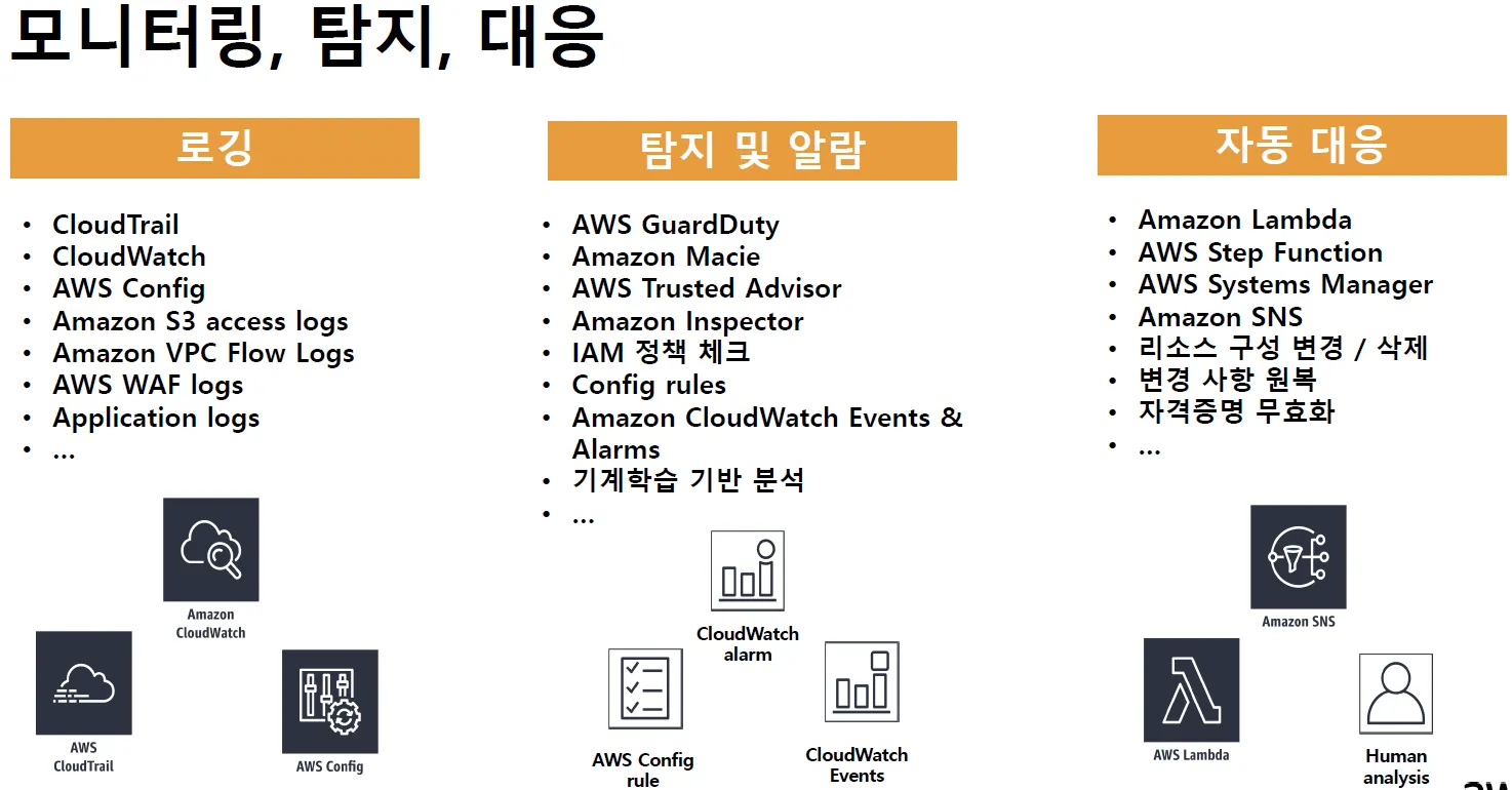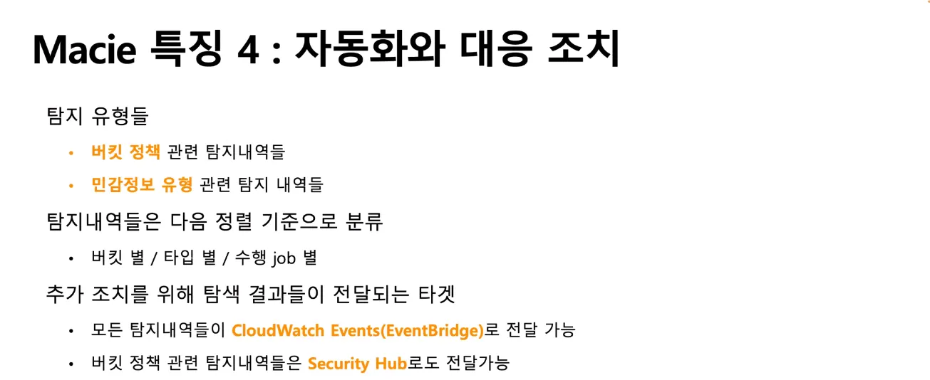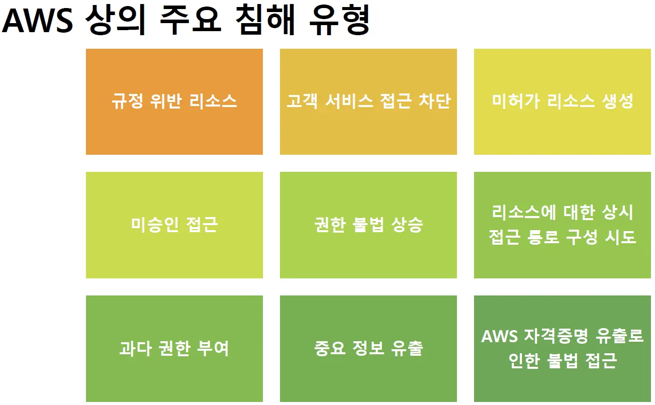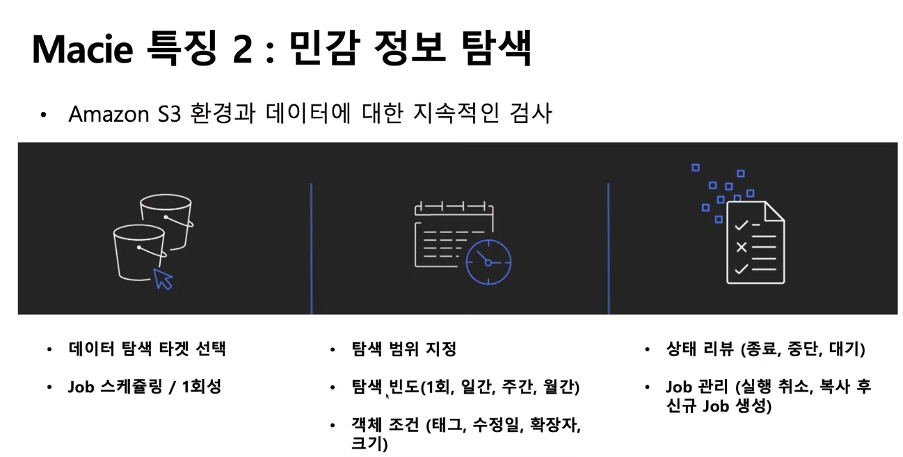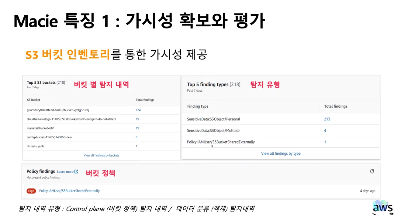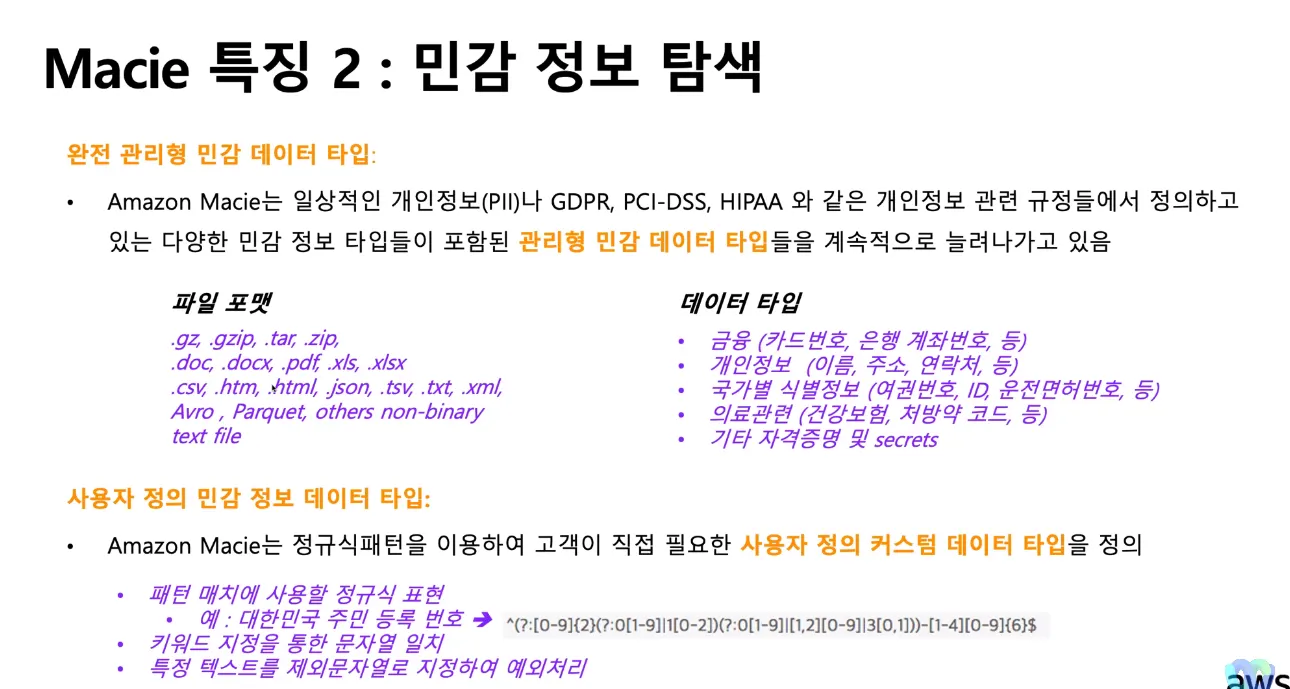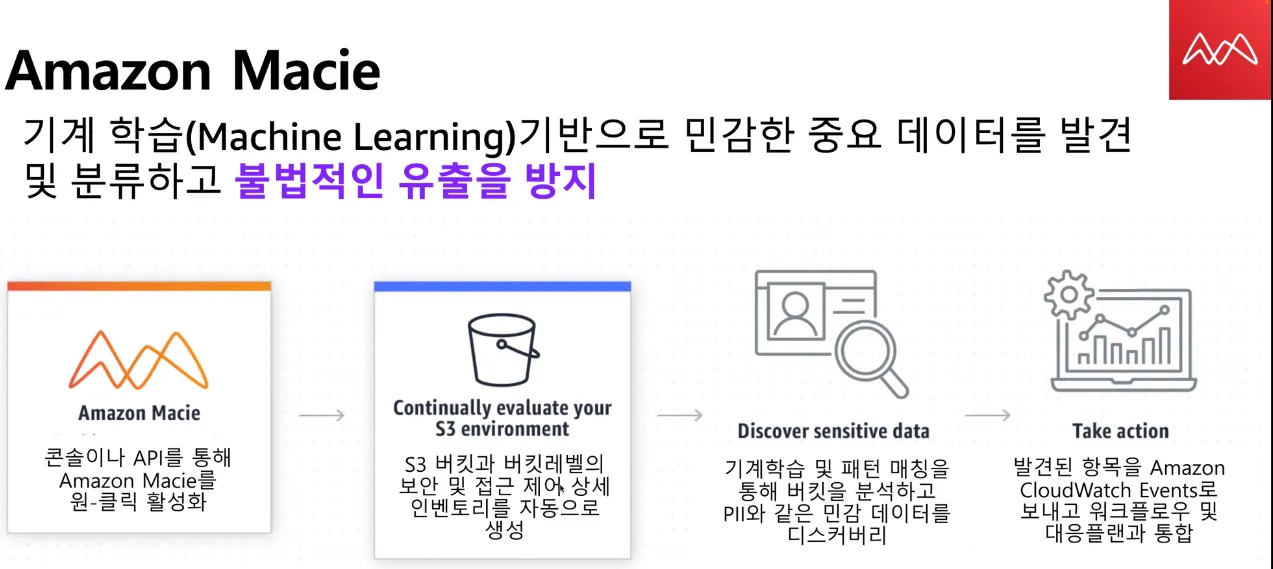 미승인 접근, 리소스에 대한 상시 접근 통로 구성 시도, AWS 자격증명 유출로 인한 불법 접근 → Amazon Macie