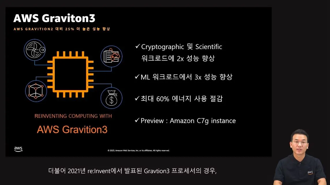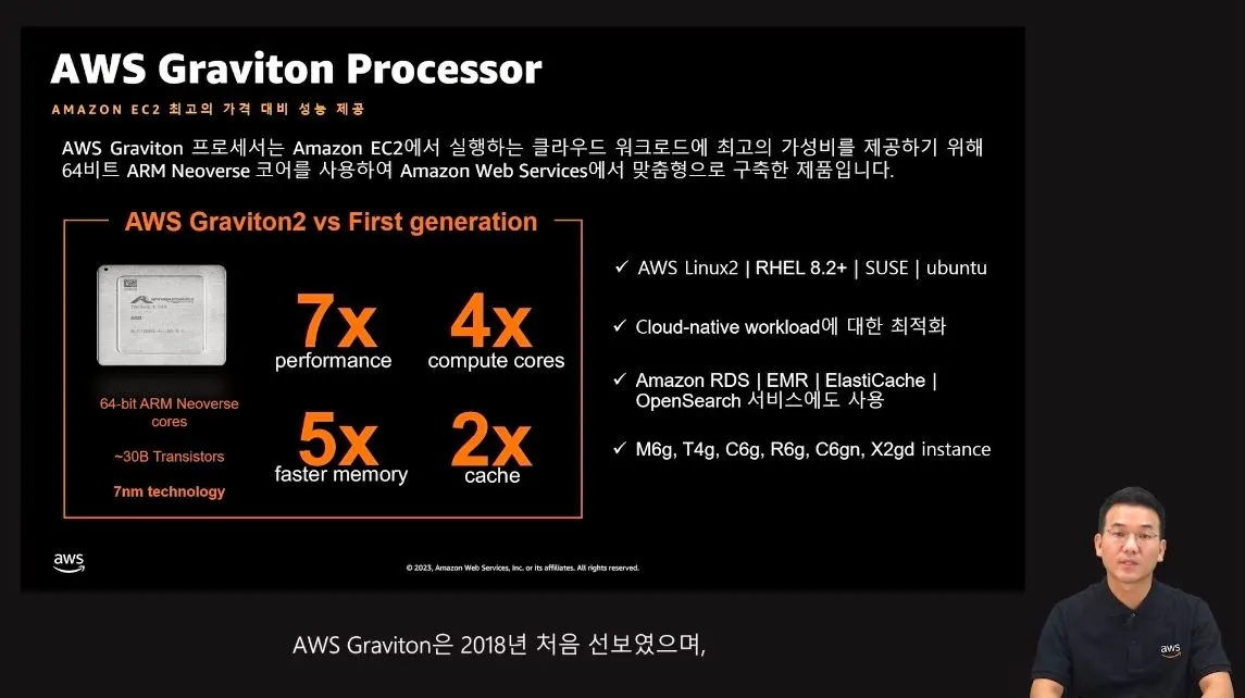 Graviton은 ARM기반으로 개발되었으며 기존 프로세서 대비하여, 더 저렴한 가격으로 더 높은 성능을 보여줌.