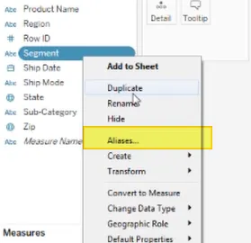 1. To assign an alias to multiple data values at once: Right-click on the data field in the Data pane and choose Aliases.