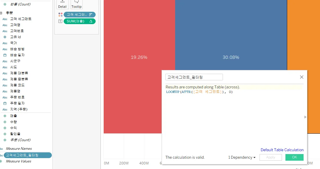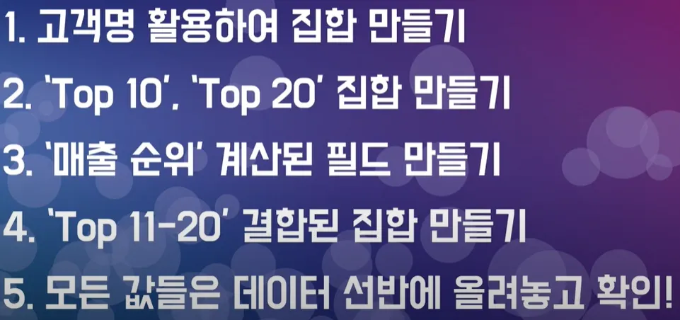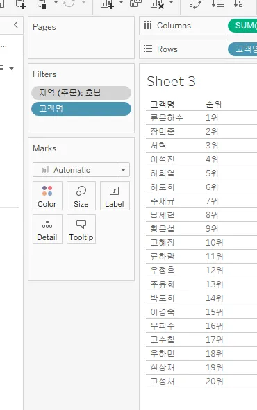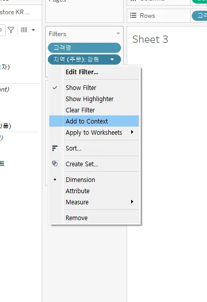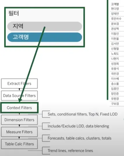지역, 고객명(Dimension Filter)내에서 TOP N을 검색하기 위해 Context Filter를 사용한다.