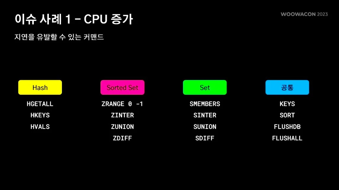 Redis 사용시 지연을 유발시키는 커맨드 자체를 사용하지 않는것이 좋다.