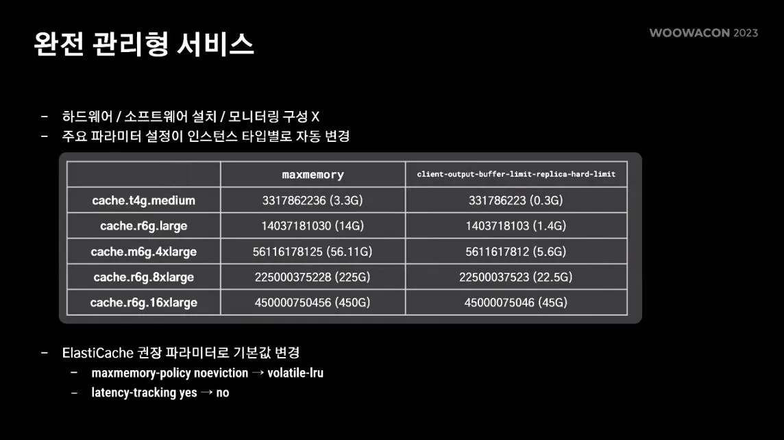 Redis 기본 파라미터를 사용하지 않고 EalstiCache가 추천/운영하기 효율적이라고 생각하는 파라미터로 기본 파라미터가 변경되어 있음.