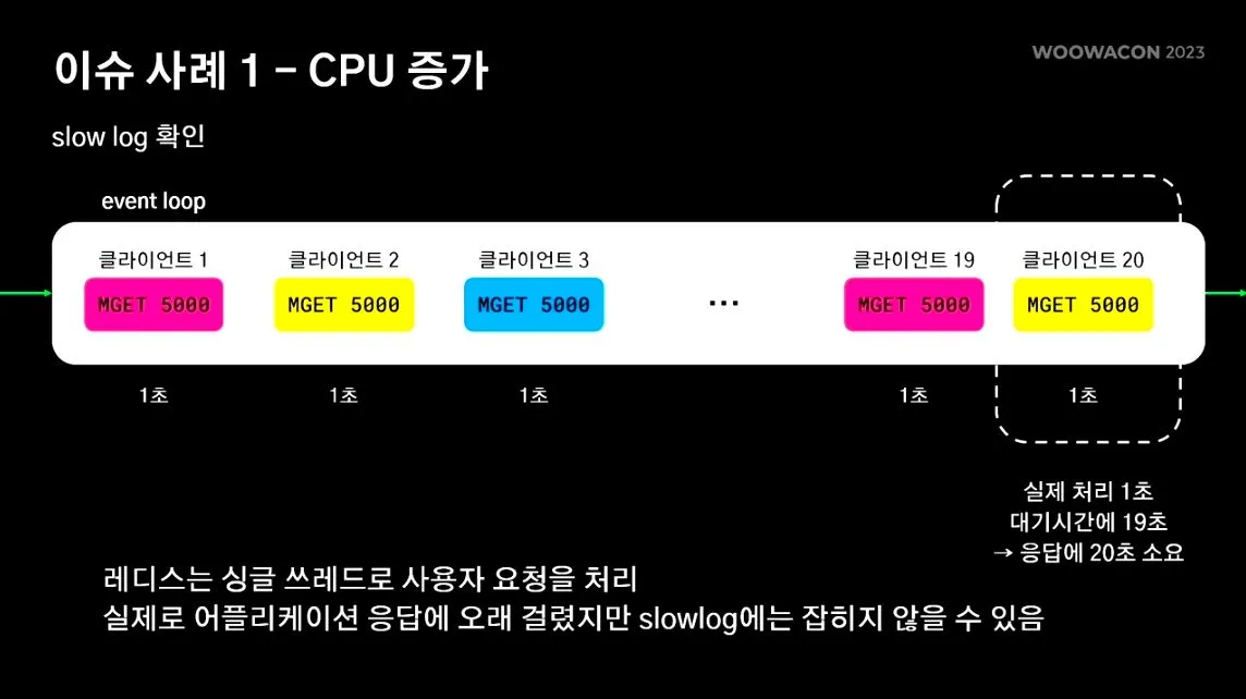 위 예에서는 mget 커맨드로 5000개 이상의 키를 가져오느라 뭔가 지연이 길어짐
