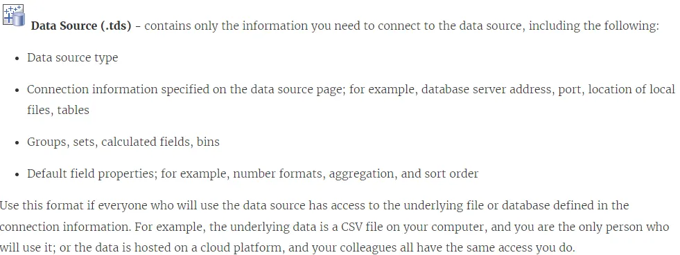 데이터 원본(Tableau Data Source, .tds) - 다음을 비롯하여, 데이터 원본 연결에 필요한 정보만 포함됨.